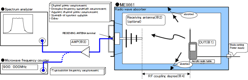 无线设备的传输特性评估是通过将频谱分析仪或微波频率计数器连接到接收天线终端来完成的。
